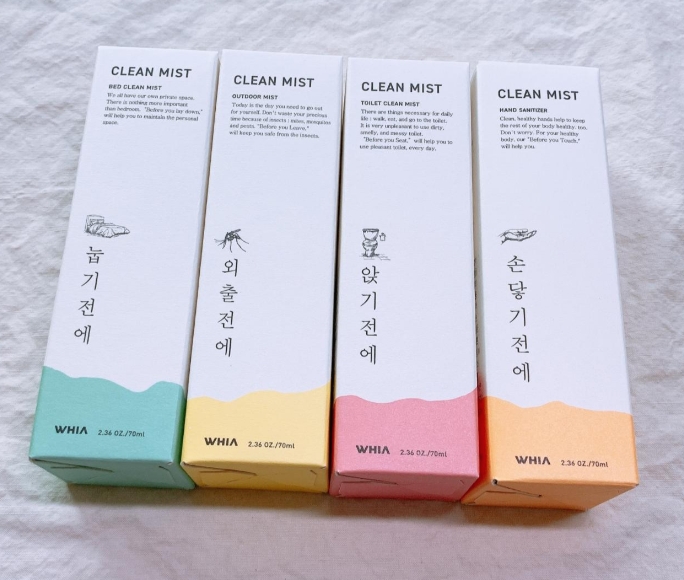 외부 화장실을 갔는데 변기가 더러워서 그냥 나왔던 경험, 사계절 내내 벌레들 때문에 불편했던 경험, 자주 세탁하기 힘든 침구류의 위생이 걱정되던 경험, 손을 씻어도 찜찜함 때문에 손 소독제를 사용한 경험 등이 있으신 분들이라면 휘아 클린 미스트 4종으로 한꺼번에 해결할 수 있어요.