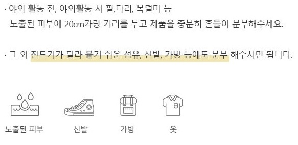 사용하는 방법은 야외 활동 전, 야외 활동 시 팔, 다리, 목덜미 등 노출된 피부에서 약 20cm가량 거리를 두고 제품을 충분히 흔들어 준 다음 분사해 주세요. 그 외 진드기가 달라붙기 쉬운 섬유, 신발, 가방 등에도 분사해 주시면 됩니다.