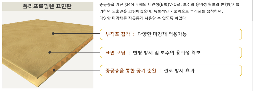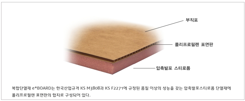이보드는 벽지, 타일 등 다양한 마감재를 적용할 수 있는 부직포와 폴리프로필렌 표면 한 압축발포 스티로폼으로 구성되어 있습니다.