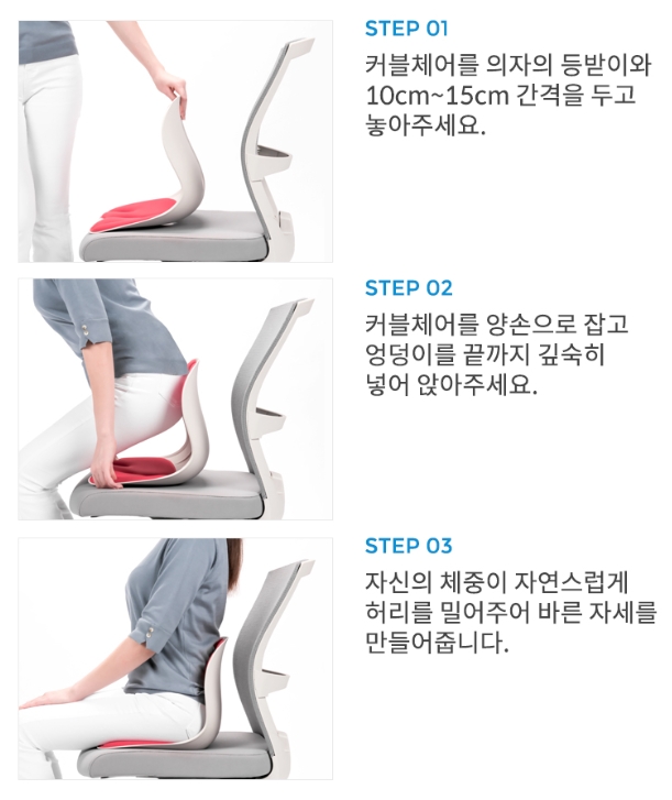 좌식의자라서 일반의자는 따로 구입해야 하겠네라고 생각하는 분들도 계실 텐데요. 커블체어 와이더는 기본적으로 좌식의자의 구조를 가지고 있지만 일반 의자에서도 사용이 가능하다고 하니 그런 고민은 하지 않으셔도 될듯해요.