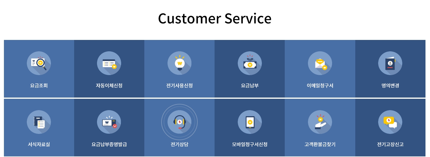 전기요금 계산기를 이용하기 위해서는 제일 먼저 한국전력공사 홈페이지로 들어가야 하는데요. 한전이라고 검색해도 나오니 참고하시고요. 이렇게 한전 홈페이지를 방문해서 아래쪽으로 스크롤을 내리다 보면 사진처럼 Customer Service라고 나오게 돼요. 거기서 제일 좌측 상단의 요금 조회를 클릭하시면 됩니다.