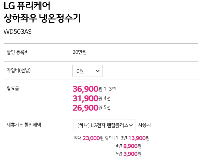 이 정도면 정수기 곰팡이, 세균은 걱정 없겠다 싶어서 렌탈을 하기로 마음먹었는데요. 그래도 일단 중요한 건 가격이겠죠? 그래서 정수기 렌탈 가격부터 알아보았어요.