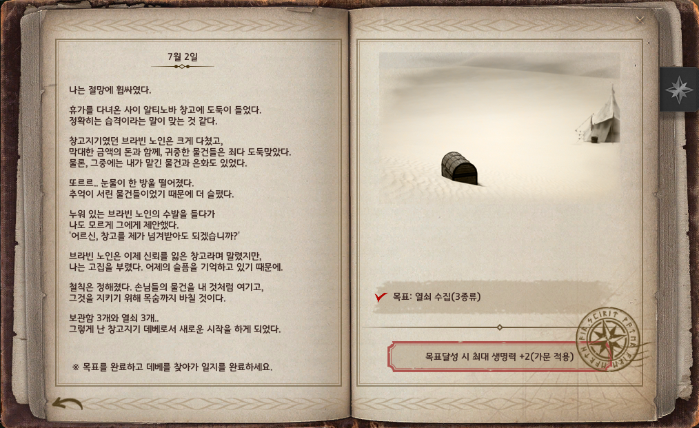 데베의 만물사전은 다른 모험일지와는 다르게 각 장마다 필요로 하는 물건을 수집하여 알티노바 <창고지기> 데베에게 보여주면 되는 방식이에요. 데베의 만물사전을 완료하면 가문 전체가 효과를 받을 수 있는 최대 생명력 증가, 최대 소지 무게 증가, 모든 공격력 증가를 얻을 수 있어요.