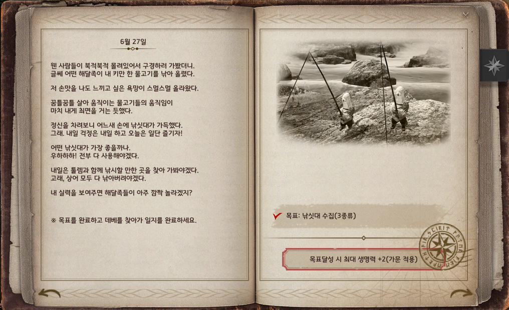 NPC에게 구입할 수 있는 낚싯대와 아벨린 의뢰로 얻는 세찌 낚싯대, 제작 낚싯대 중 3종류를 가지고 가면 완료할 수 있어요.