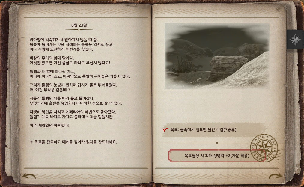 - 바다빈 물안경, 뻐끔뻐끔 물안경 아이템이 해당 모험일지 완료에 활용되지 않도록 변경되었습니다. (추가)