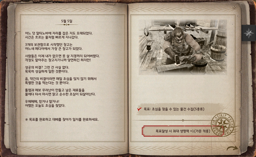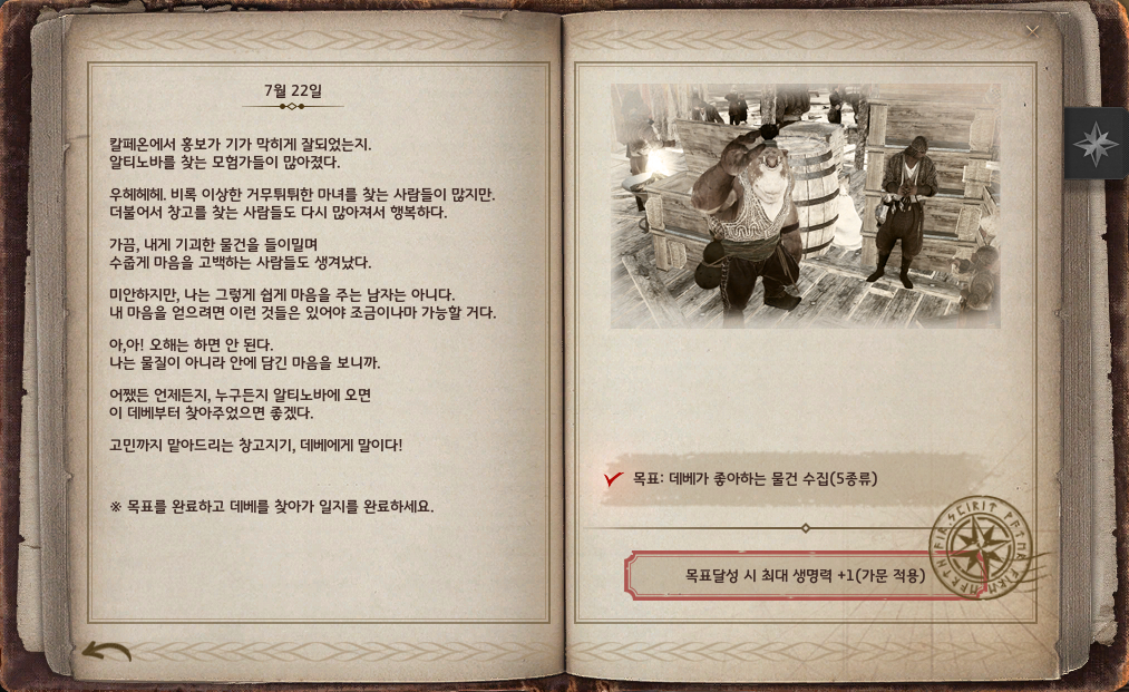 데베의 만물사전은 다른 모험일지와는 다르게 각 장마다 필요로 하는 물건을 수집하여 알티노바 <창고지기> 데베에게 보여주면 되는 방식이에요. 데베의 만물사전을 완료하면 가문 전체가 효과를 받을 수 있는 최대 생명력 증가, 최대 소지 무게 증가, 모든 공격력 증가를 얻을 수 있어요.