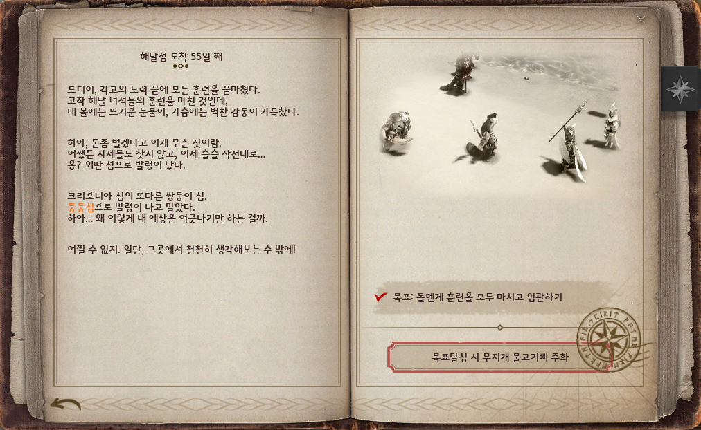 '[크리오니아] 가슴 설레이는 임관'까지 끝내고 모험일지 5권 3장을 완료하면, 보상으로 '[지식] 크리오니아 대장군' '칭호[해달전사]' '불락의 꽃게기사 둔갑서(영구)'를 획득해요.