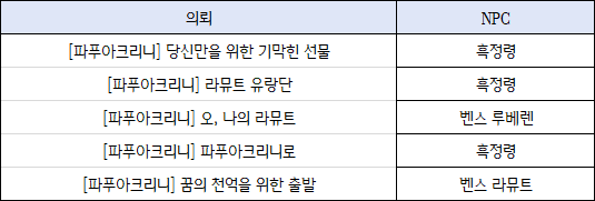가라니아의 부관이 되어 라뮤트 유랑단 모험일지 3권 3장을 완료하면, 마지막 메인 의뢰 [파푸라오라] 승리의 열매전사를 수락할 수 있어요.