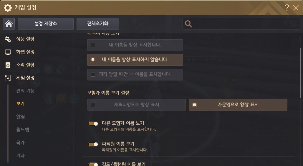 - 해당 설정의 기본 설정값은 가문명으로 항상 표시입니다.