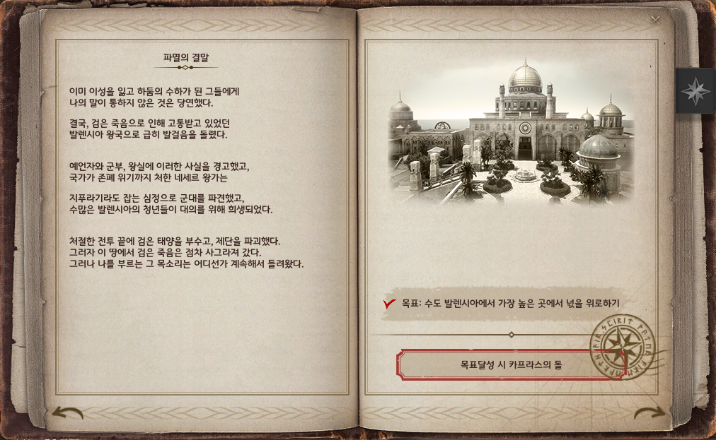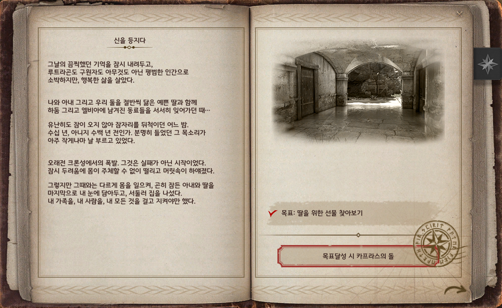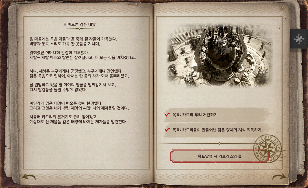 | 카프라스의 기록 4권 6장 | ‘피의 제단, 세 번째 환상’ 완료하기 | 피의 제단 선행 의뢰 모두 완료하기 |