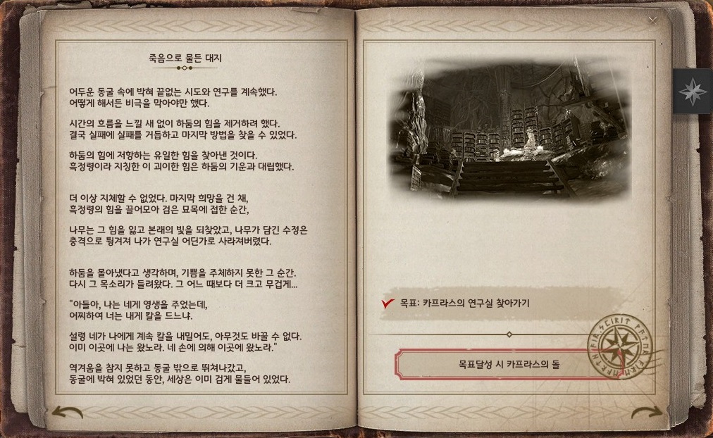 | 카프라스의 기록 2권 5장 | 처치해야 하는 몬스터의 개체 수 3000마리 | 처치해야 하는 몬스터의 개체 수 1000마리 |