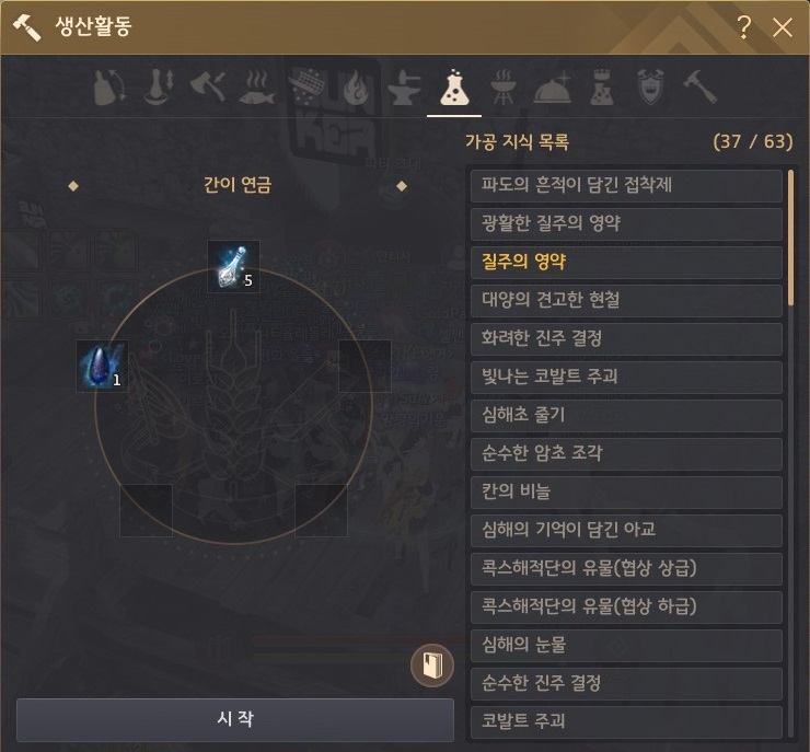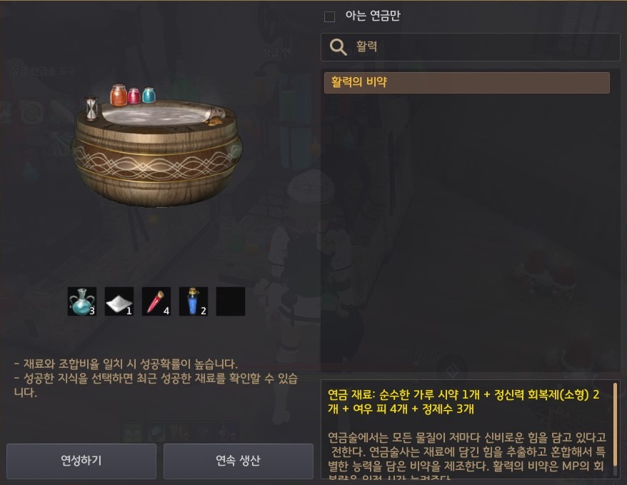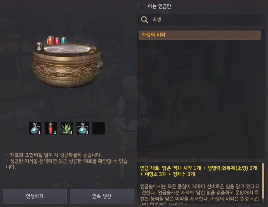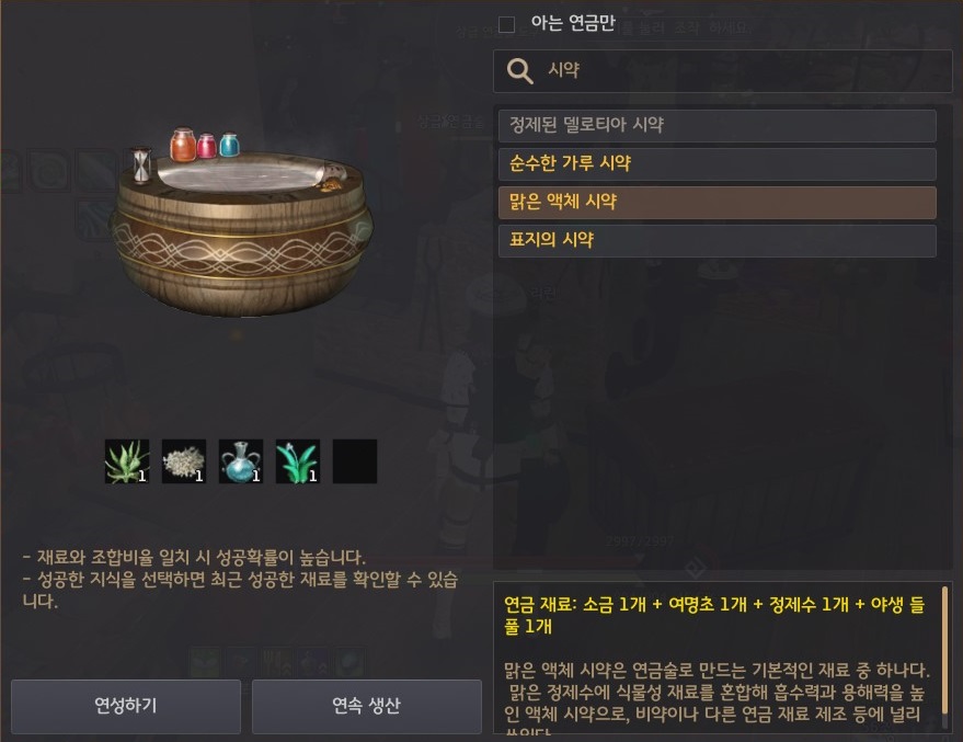 연금 레시피 - 맑은 액체 시약 1개, 생명력 회복제(소형) 2개, 여명초 3개, 정제수 3개