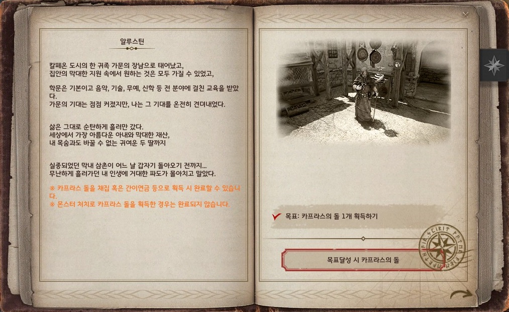 단, 사냥으로 획득하는 카프라스의 돌은 해당 모험일지를 완료해주지 않아요.
