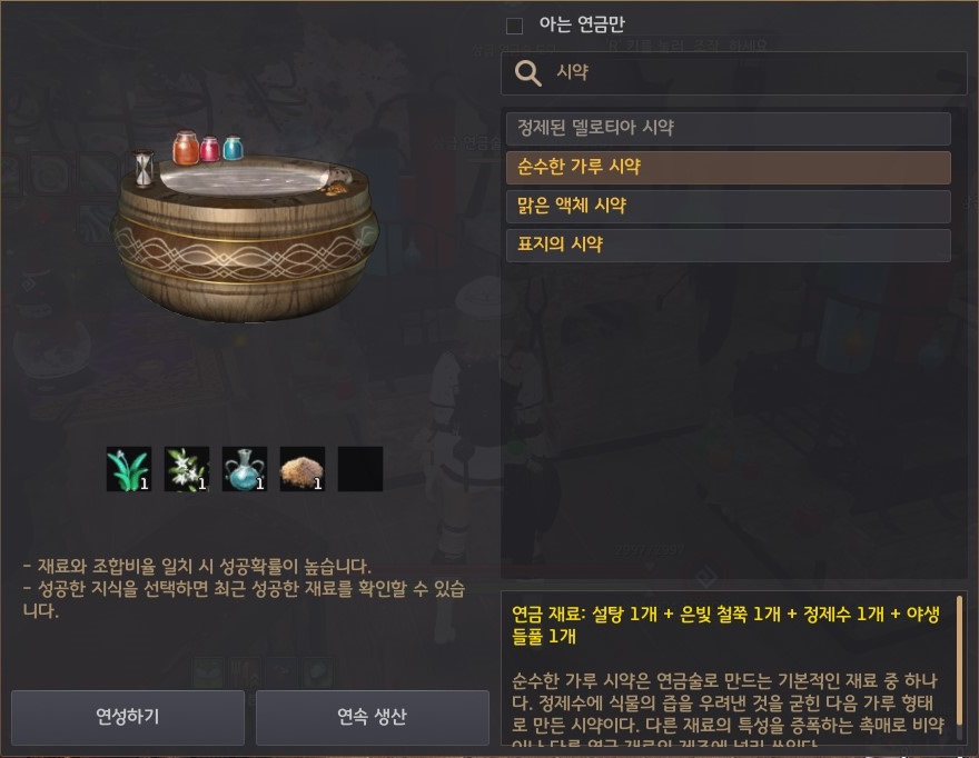 연금 레시피 - 정제수 1개, 설탕 1개, 은빛 철쭉 1개, 야생 들풀(잡초) 1개