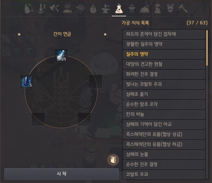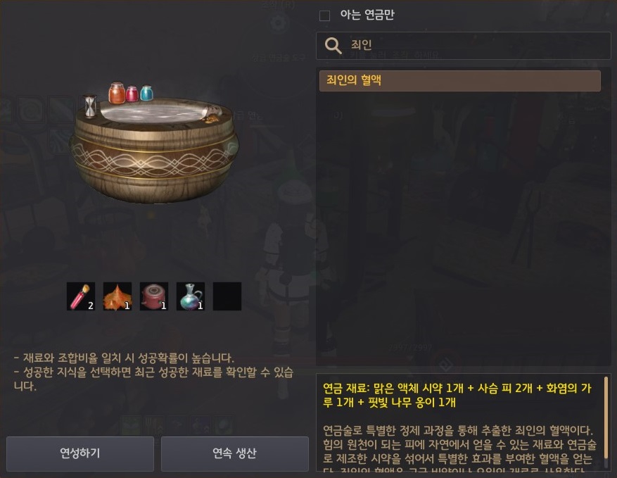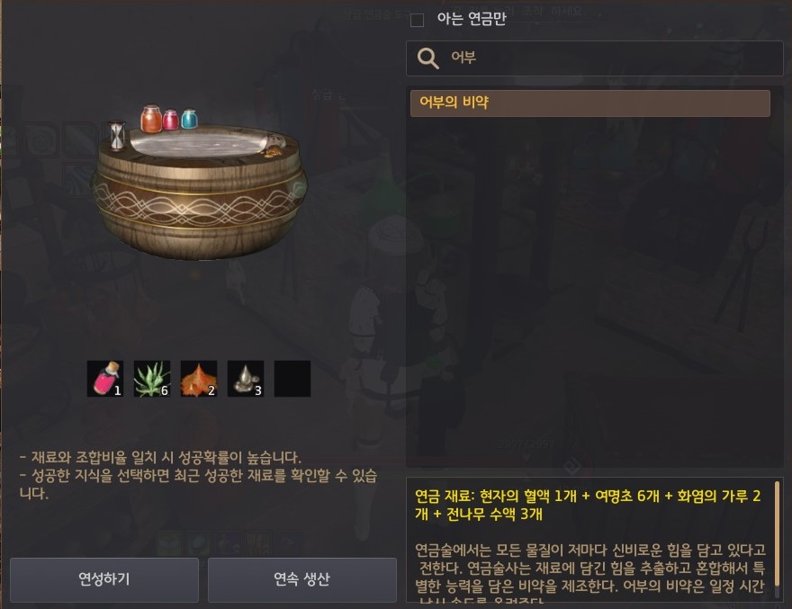 연금 레시피 - 현자의 혈액 1개, 여명초 6개, 화염의 가루 2개, 전나무 수액 3개