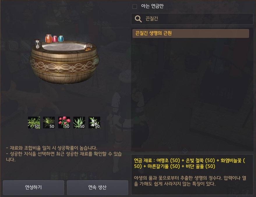 연금 레시피 - 화염비늘꽃 50개, 은빛 철쭉 50개, 마른갈기풀 50개, 비단 꿀풀 50개, 여명초 50개