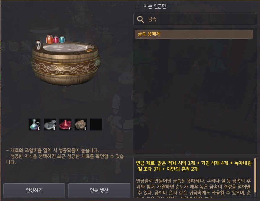 연금 레시피 - 맑은 액체 시약 1개, 거친 석재 4개, 녹아내린 철 조각 3개, 야만의 흔적 2개