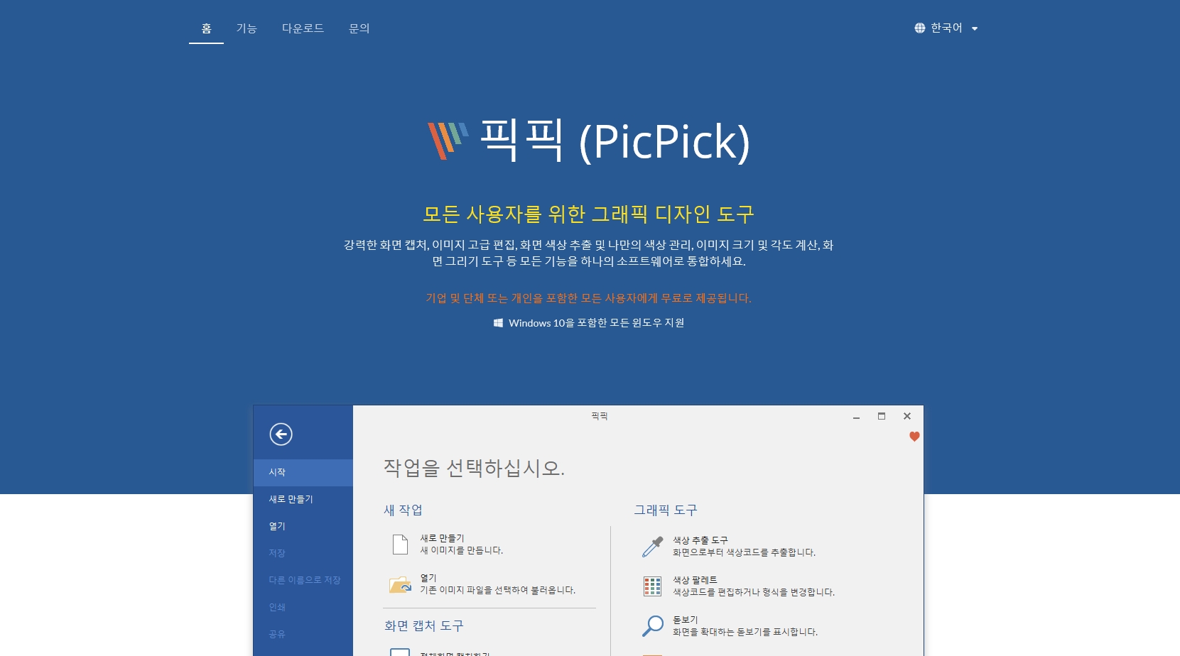 먼저 웹사이트에서 픽픽을 검색하시고 홈페이지를 방문하시면 위와 같은 화면이 나오실 거예요. 상단의 홈, 기능, 다운로드, 문의 이렇게 나와있는데요. 여기서 다운로드를 클릭하시면 됩니다.