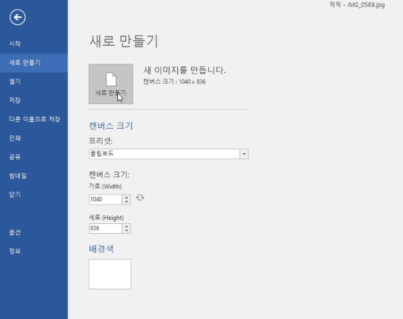 그리고 새로 만들기로 열면 잘라낸 크기의 이미지만큼 캔버스 크기가 생성되어 있습니다.