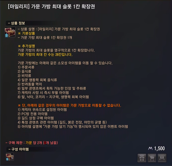 - 가문 가방은 의뢰, 마일리지 또는 펄 상점에서 가문 가방 최대 슬롯 확장권을 구매하여 사용하면 가방 내 ‘가문 가방’ 카테고리가 생성되어 이용할 수 있습니다.