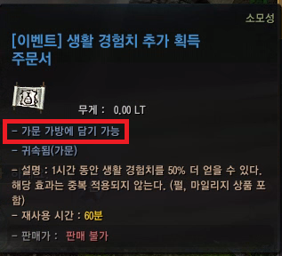 하지만 가문 가방에 제공되는 기본 무게가 100LT밖에 되지 않아 무게가 무거운 비약류는 넣기가 힘들더라구요.