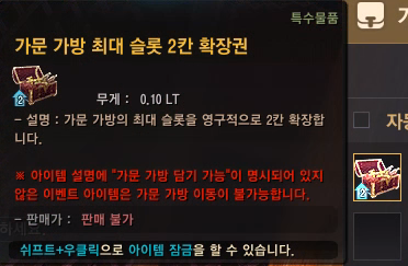 - 가문 가방 카테고리 생성 시, 최대 무게 100LT가 최초로 제공되며 가문 가방 슬롯은 최대 28칸까지 확장할 수 있습니다.
