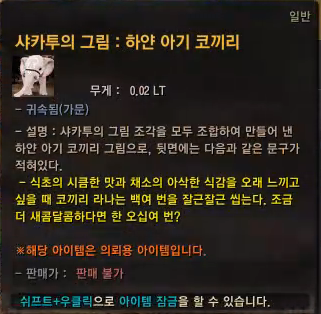 샤카투의 그림 : 하얀 아기 코끼리에 쓰인 암호를 해석해보면 채소 절임 100개 or 새콤달콤한 채소 절임 50개를 가져다주면 돼요.
