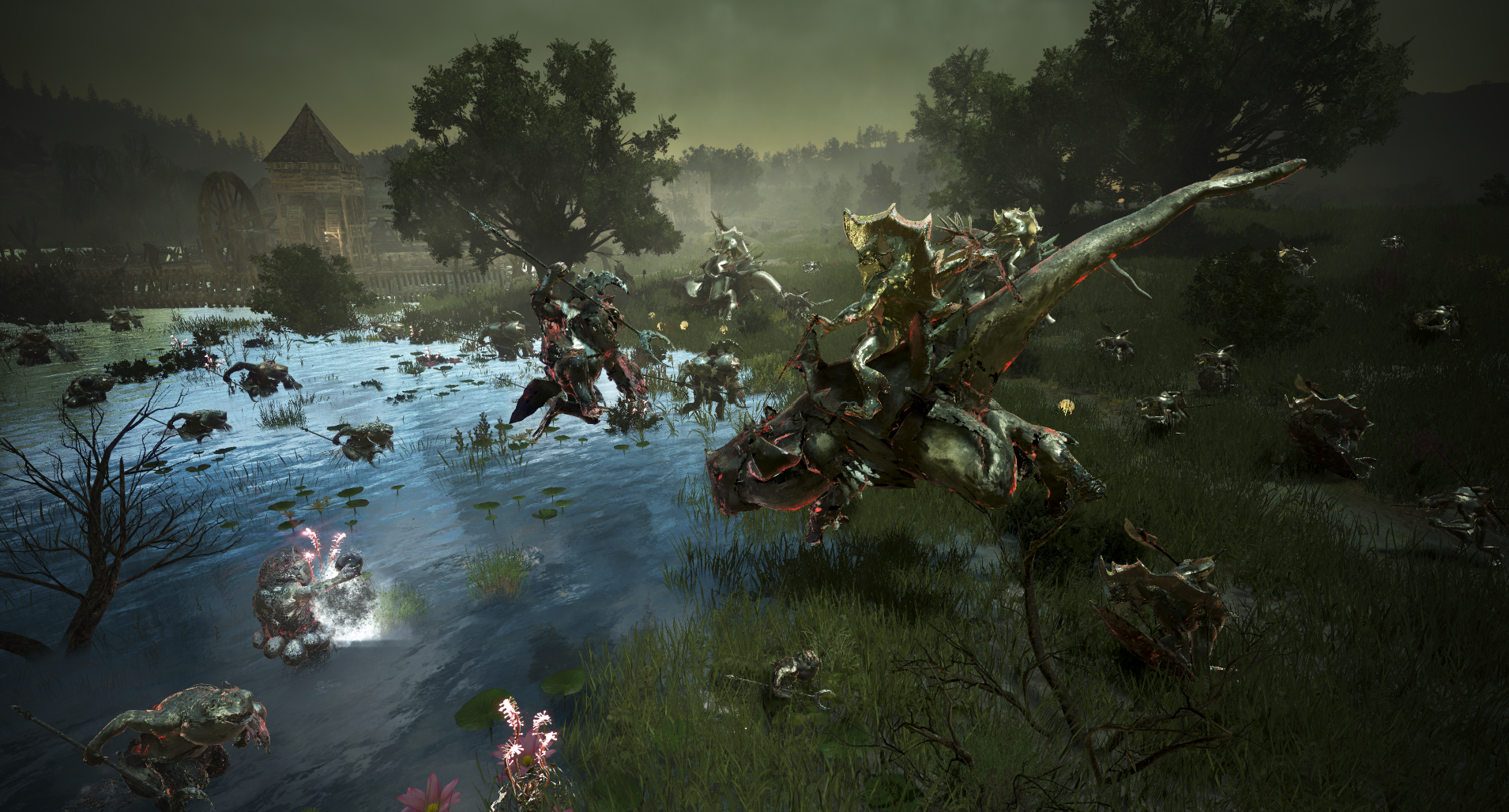 늪지 나가 부대장을 공격하면, 그의 수하들이 사방에서 쏟아지며 모험가를 위협합니다. 또한, 늪지 곳곳에 맹독식물이 있는데, 처치 시 주변 몬스터들의 방어력을 낮추고 모험가는 독 피해를 받기 때문에 맹독식물을 어떻게 처치하고 활용할지 고민해야 합니다. 마찬가지로 나가의 적수인 포건이 습격해 들어와 위협할 수도 있습니다. |