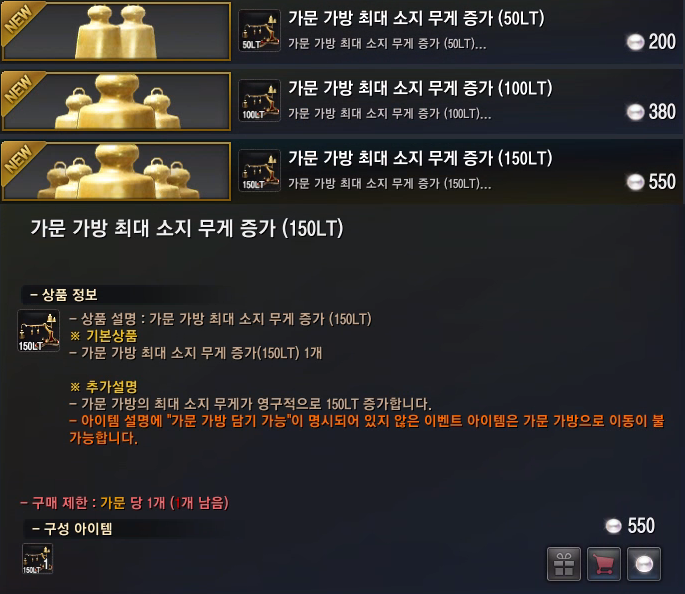 가문 가방 무게는 의뢰로 50LT, 마일리지로 50LT, 펄 상점에서 50LT, 100LT, 150LT를 가문당 1개씩 구입할 수 있어요.
