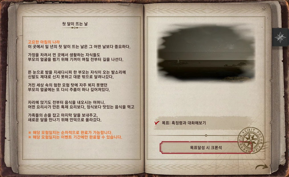 설맞이 모험일지는 간단하게 이동과 대화를 통해서 완료할 수 있으니 기간 내에 완료하시길 바라요.