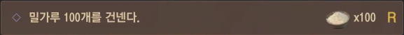 준비물로는 밀가루 100개, 닭고기 or 새 고기 10개를 챙기시면 돼요.