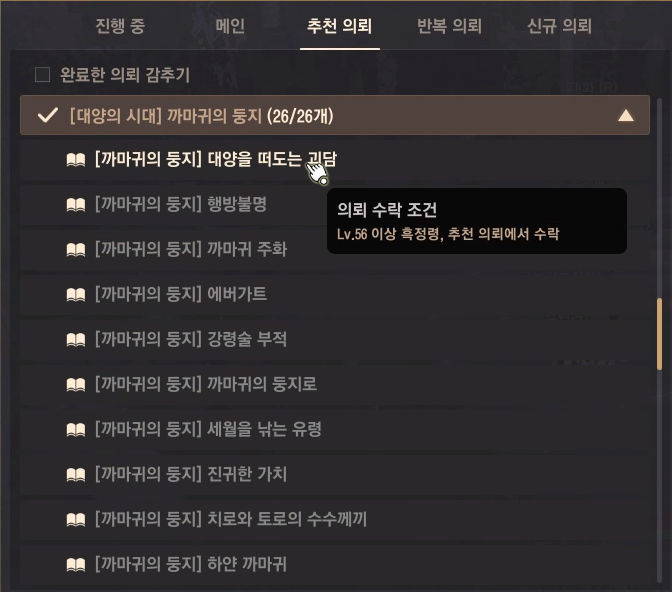 → 의뢰 받은 일(O) - 추천 의뢰 - '[대양의 시대] 까마귀의 둥지' 연속 의뢰를 진행하면 돼요. 선행 의뢰는 따로 없고 Lv.56 이상 흑정령에게서 의뢰를 수주해 진행할 수 있어요.