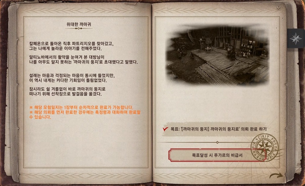 → 의뢰 받은 일(O) - 추천 의뢰 - '[대양의 시대] 까마귀의 둥지' 연속 의뢰를 전부 완료해야 보상으로 받을 수 있어요.