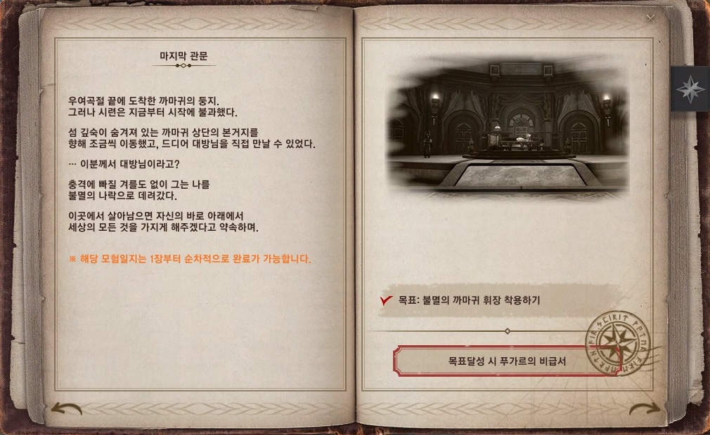 → 마지막으로 다시 푸가르를 찾아가 대화하고 모험일지를 완료하면 칭호 '까마귀의 후예'를 획득할 수 있어요.