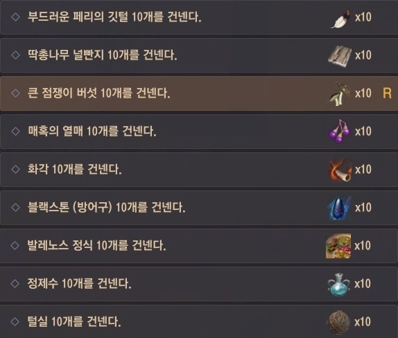필요한 준비물은 큰 점쟁이 버섯, 발레노스 정식, 부드러운 페리의 깃털, 딱총나무 널빤지, 매혹의 열매, 화각, 정제수, 블랙스톤(무기 or방어구), 털실을 각 10개씩 가져가서 보여주면 돼요.