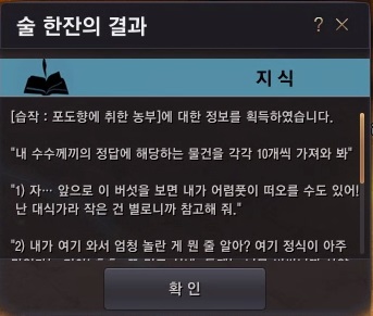 연속 의뢰를 할 때, 지식 1개를 획득할 수 있었어요. 처음 지식을 획득하고 그 뒤로 4일 정도 간격으로 아도나 리오블랑을 찾아가면 나머지 지식들도 다 획득할 수 있어요.