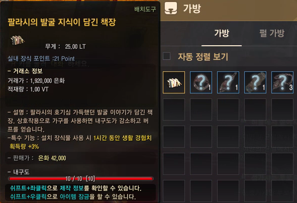 팔라시의 항해 지식이 담긴 책장, 팔라시의 발굴 지식이 담긴 책장, 팔라시의 수렵 지식이 담긴 책장 중에 택 1개 획득