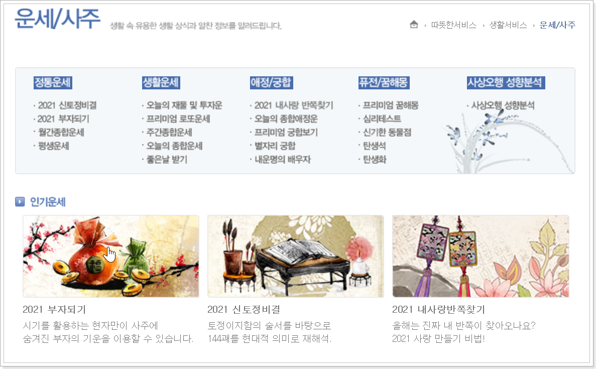 신한생명 홈페이지에서도 오늘의 운세 무료보기를 제공하고 있는데요. 오늘의 운세뿐만 아니라 정통운세, 생활운세, 애정/궁합, 퓨전/꿈해몽, 사상오행 성향분석 등 다양한 운세와 사주 정보를 무료로 이용할 수 있습니다.