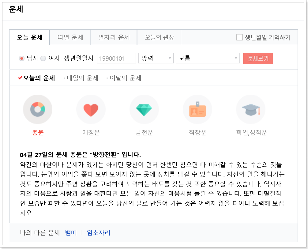 다음에서 볼 수 있는 오늘의 운세는 띠별, 별자리, 생년월일 이렇게 세 가지가 있습니다.