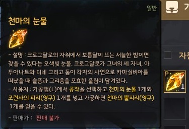 - 천마의 눈물을 조련사의 피리(영구)와 공작(L)하면 천마의 뿔피리를 얻을 수 있습니다.