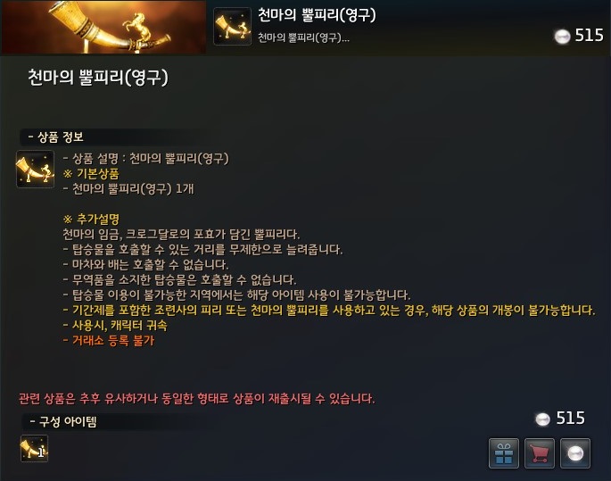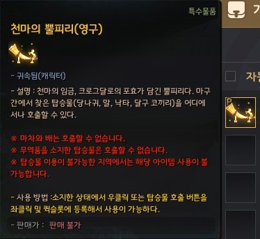 - 기존 탑승물 호출이 불가했던 지역에서는 천마의 뿔피리를 사용할 수 없습니다.