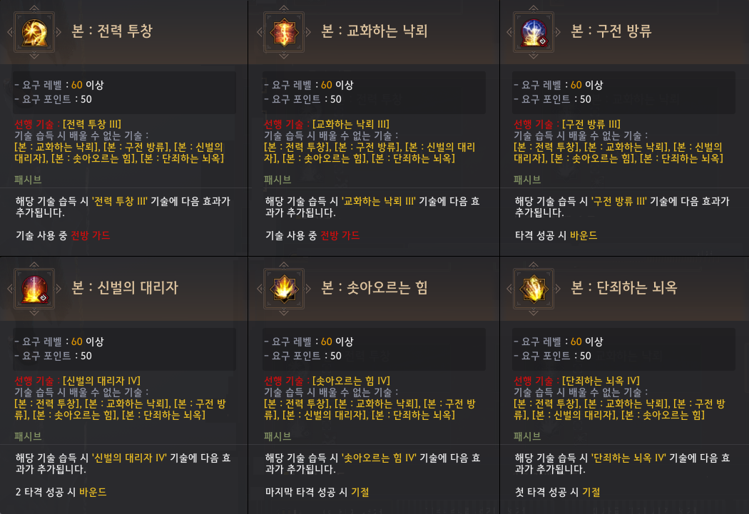 - 각 기술은 한 가지를 습득할 경우, 나머지 두 가지의 기술은 습득할 수 없습니다.