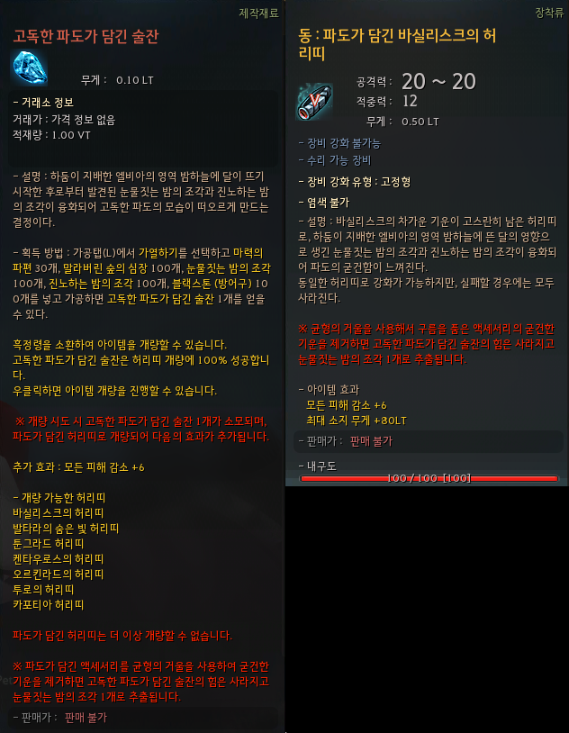 - 파도가 담긴 허리띠는 드벤크룬 대장장이 휴골에게서 구입할 수 있는 '균형의 거울'을 사용하여, 대장장이 NPC에게 개량석 추출 기능을 통해 파도를 담기 전 상태의 액세서리로 되돌릴 수 있습니다.