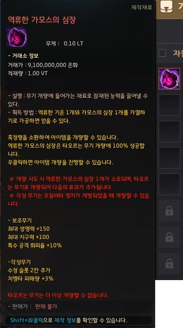지금은 각성무기, 보조무기 2개에 가모스의 심장 개량을 할 수 있기 때문에 최소한 2개의 가모스의 심장이 필요해요.
