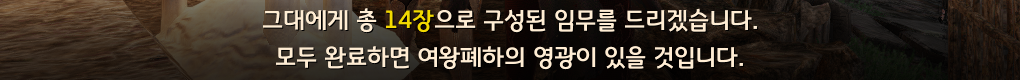 - ‘오르제카의 기록 : 용의 시간’ 의뢰 완료 후 수주받을 수 있는 14개의 임무를 모두 완료하면 비오렌치아 여왕의 영광을 받을 수 있습니다. 단, 이 과정은 굉장히 험난할 것입니다.
