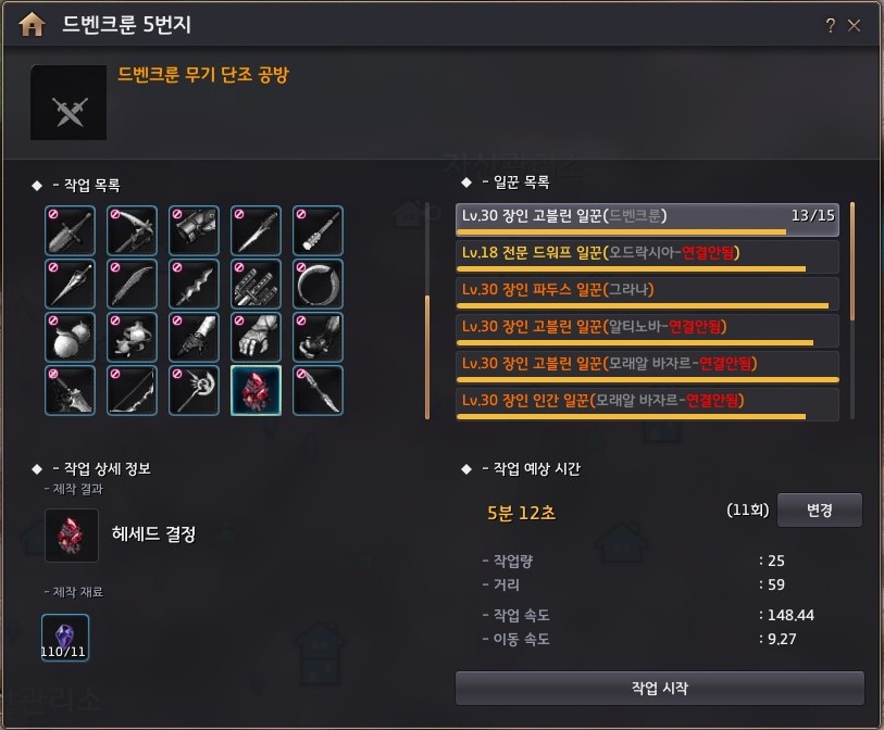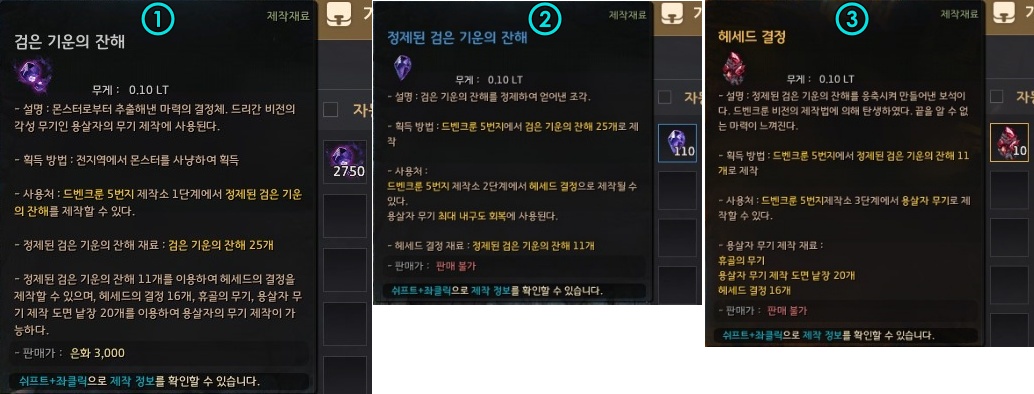→ 드리간 지역 사냥으로 획득하는 검은 기운의 잔해가 2750개가 필요해요. 검은 기운의 잔해를 가지고 드벤크룬 5번지 - 무기 단조 공방 2단계로 구매 후, 일꾼으로 작업하면 만들 수 있어요.