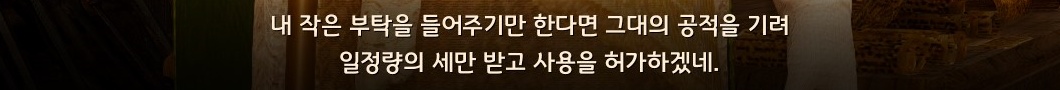- 다만, 주기적으로 '푸른 갈기 사자의 장원 매입 증서'가 황실 경매를 통해 진행됩니다. 이 증서가 있으면, 공헌도 50과 세금 없이 영구적으로 이 장원을 이용할 수 있습니다. 황실 경매 일정은 추후 안내를 통해 공지될 예정입니다.