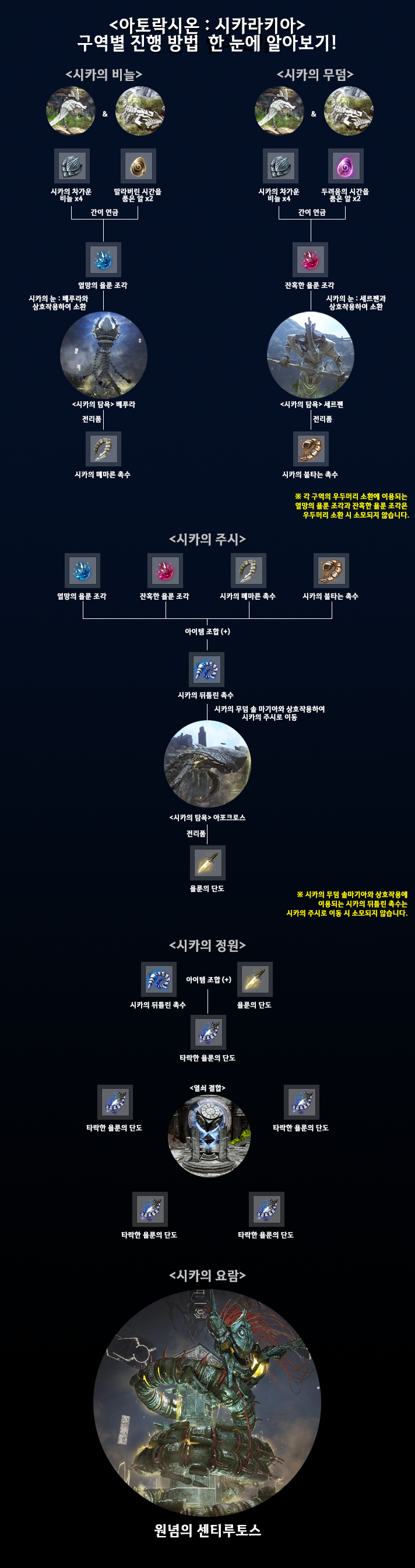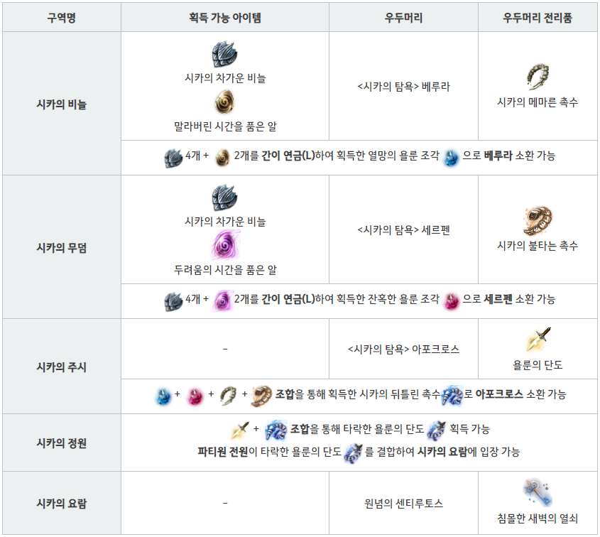 ※ 타락한 욜룬의 단도와 최종 우두머리 <원념의 센티루토스> 처치 후 획득할 수 있는 전리품을 제외한 시카라키아에서 획득한 모든 아이템은 시카의 요람에서 <원념의 센티루토스>를 처치한 후 입장할 수 있는 시카의 낙원에서 벗어나면 모두 삭제됩니다.