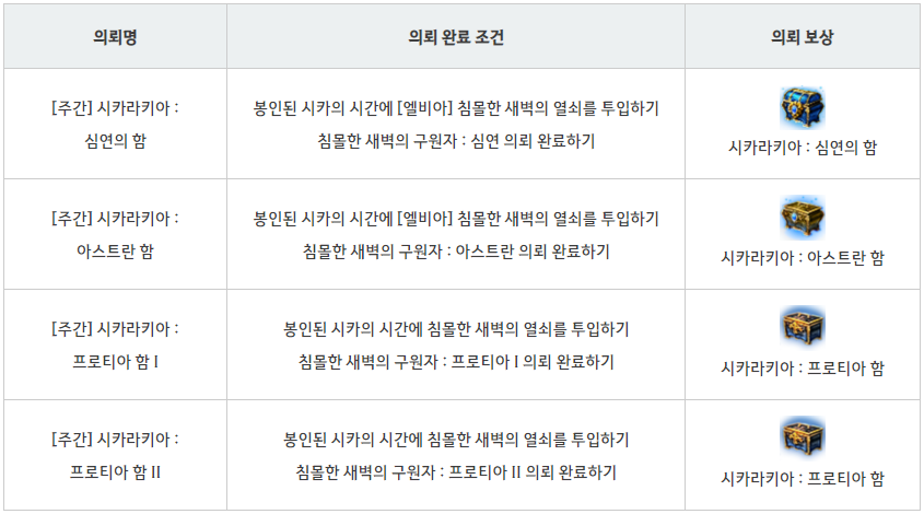 ※ 난이도에 관계없이, 시카라키아 주간 의뢰를 완료한 A 캐릭터는 해당 주에 다른 시카라키아 주간 의뢰를 수행할 수 없습니다.