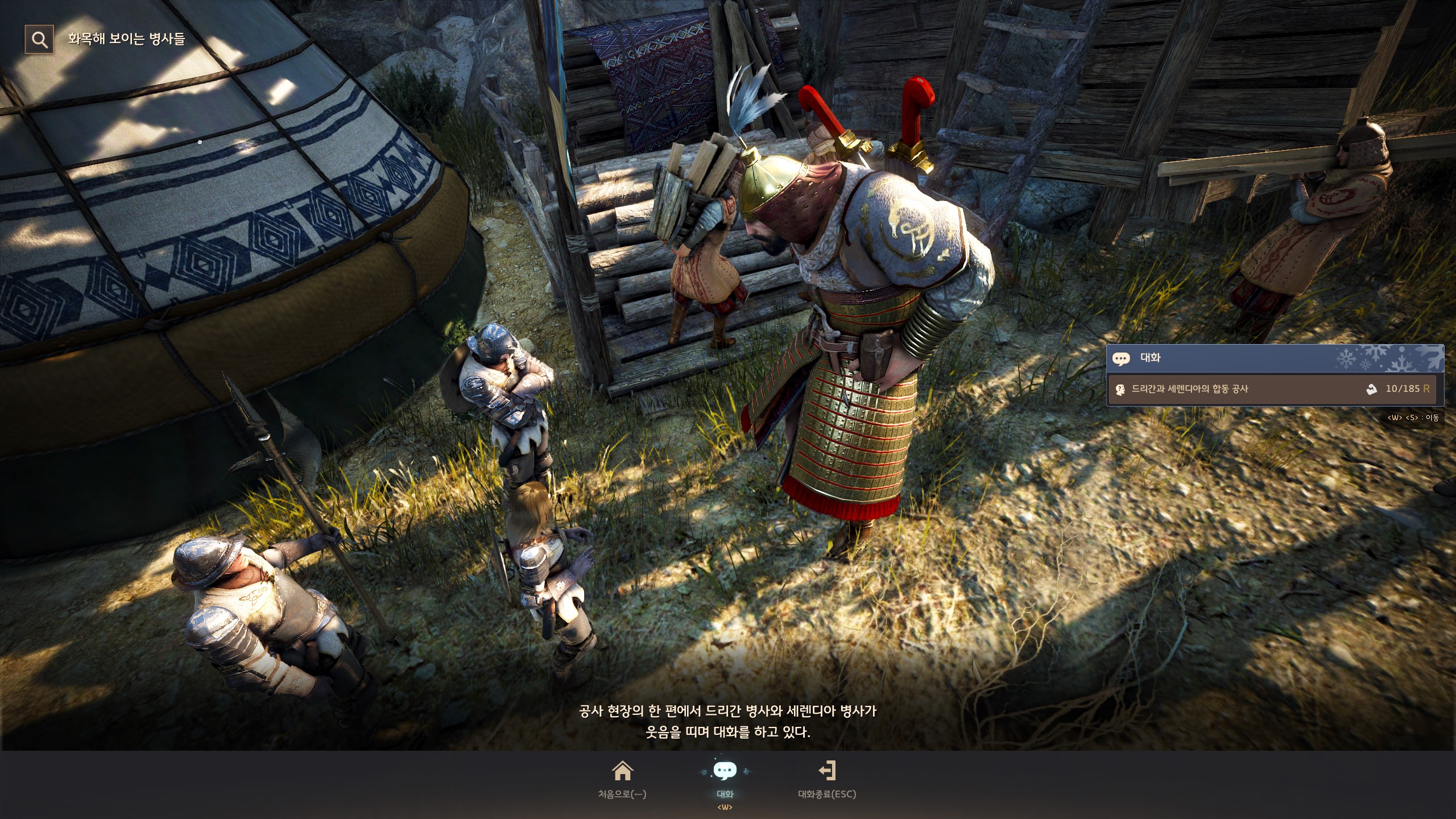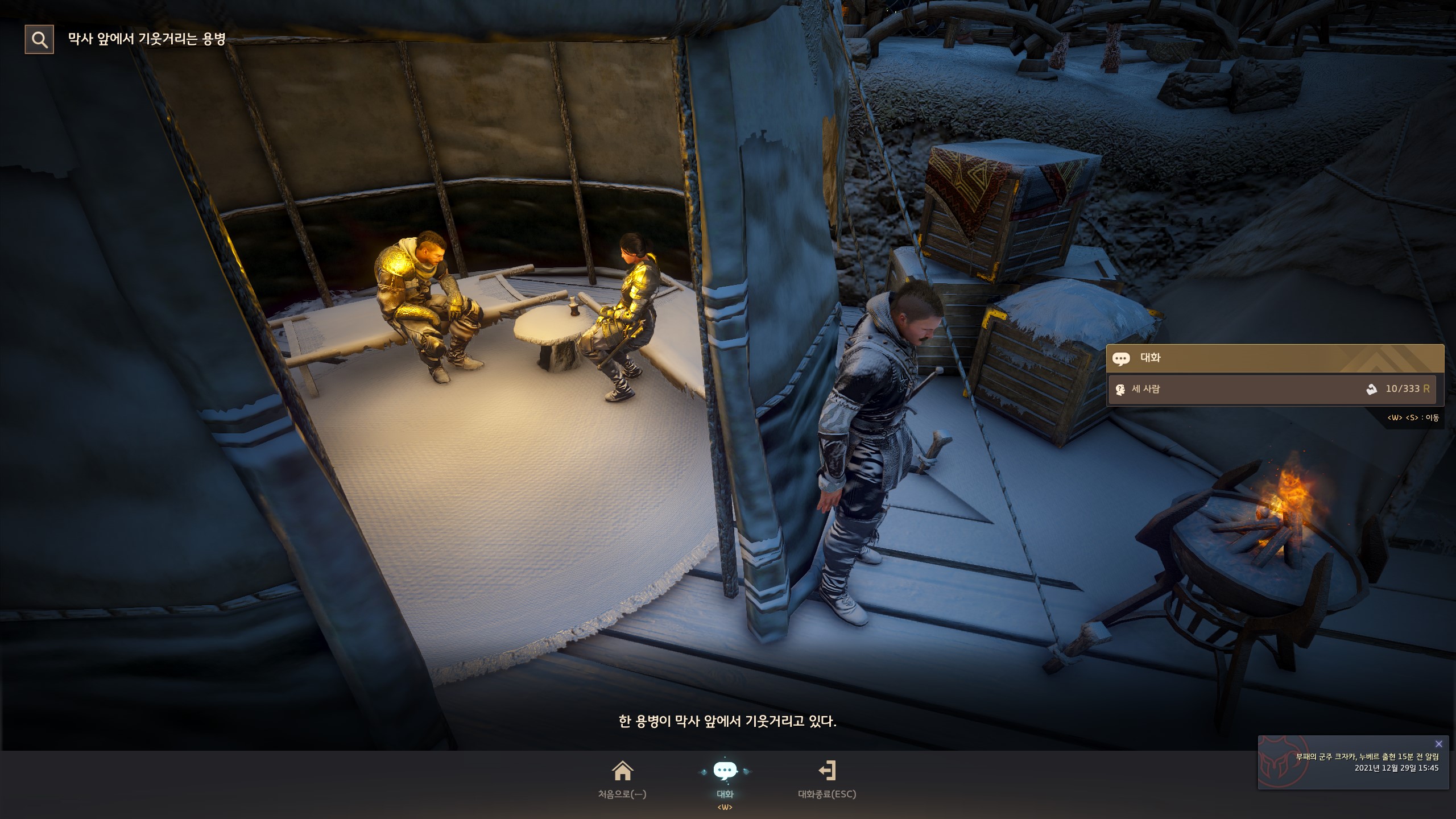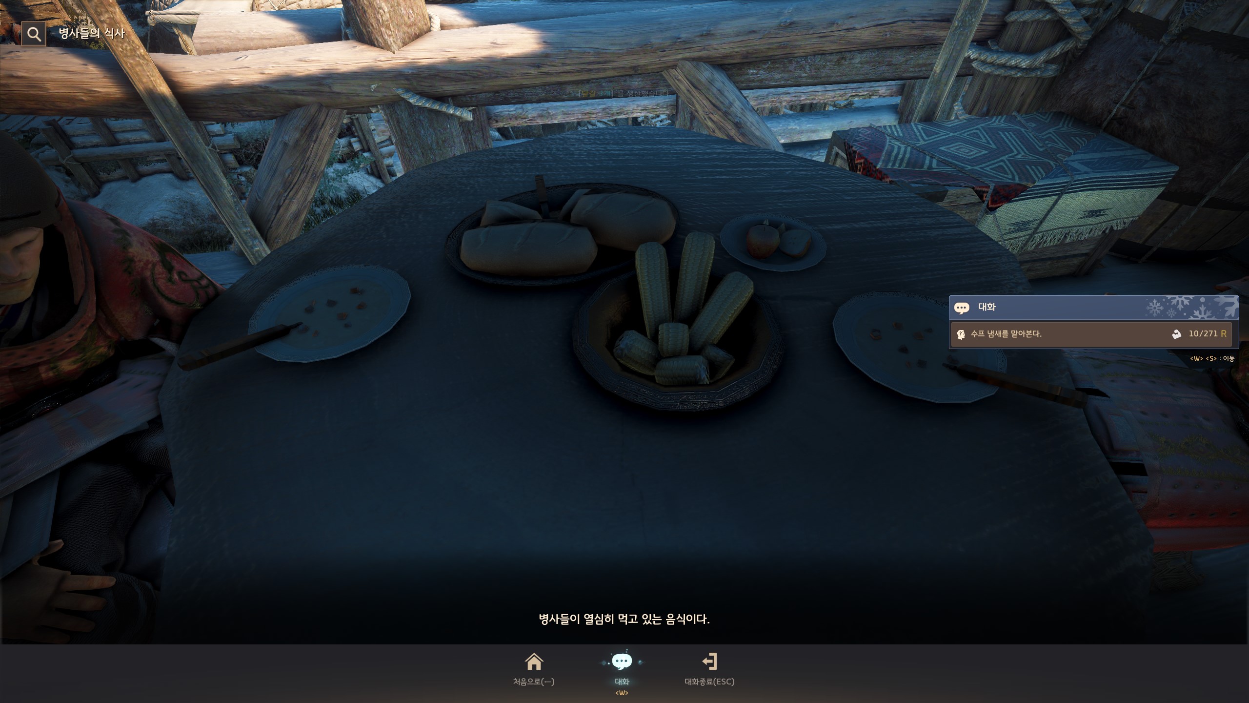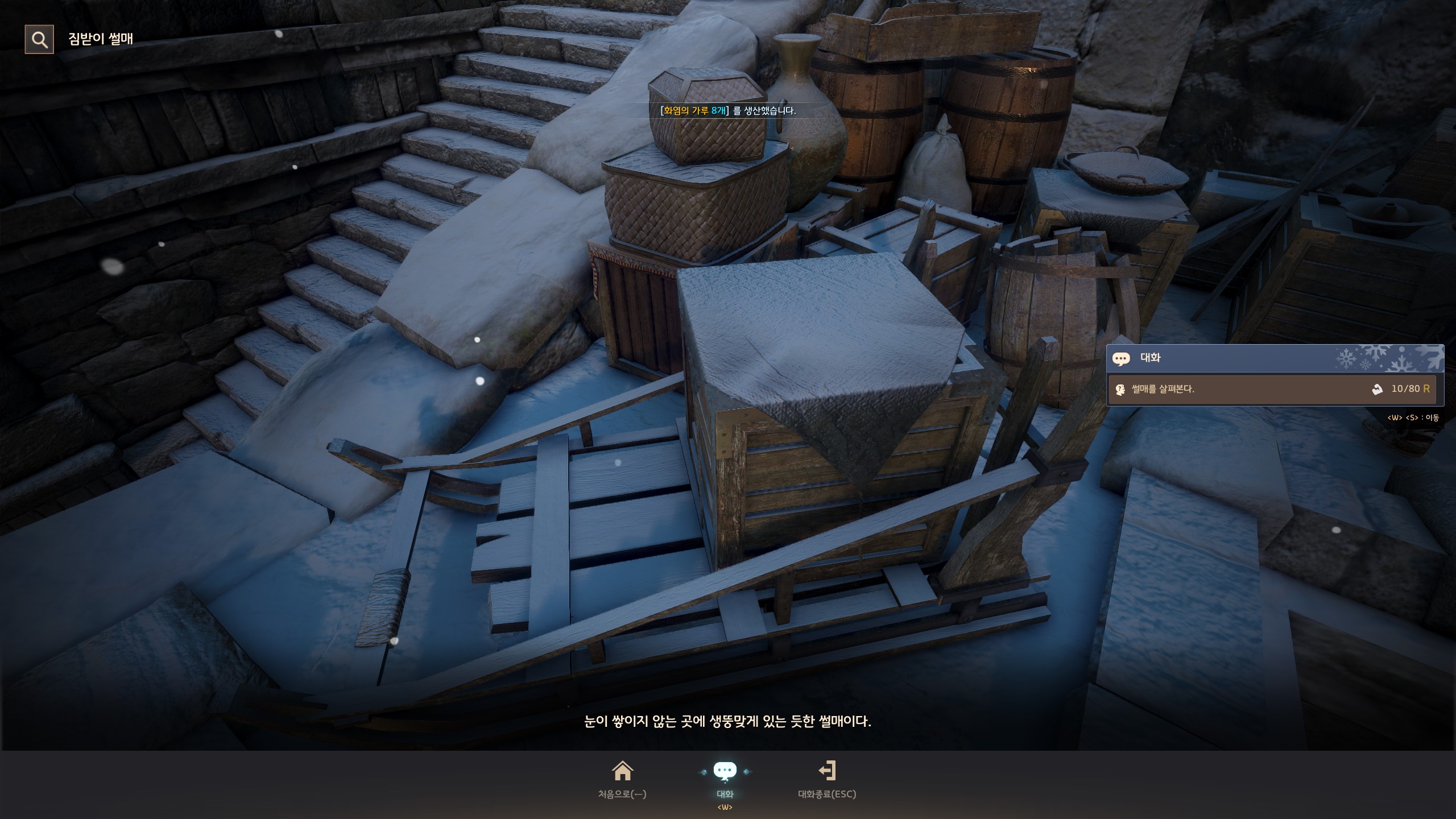 → 눈보라 초소 <탐험 거점 관리> 간볼드가 있는 막사 아래쪽에서 지식을 획득할 수 있어요. 지식 획득 시 기운 10이 소모돼요.